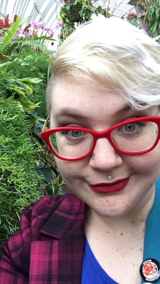 Right: Caitlin is fat and happy, looking into the camera with bright eyes and a smile. They have a pierced nose and philtrum, bright red glasses, and platinum blonde hair.