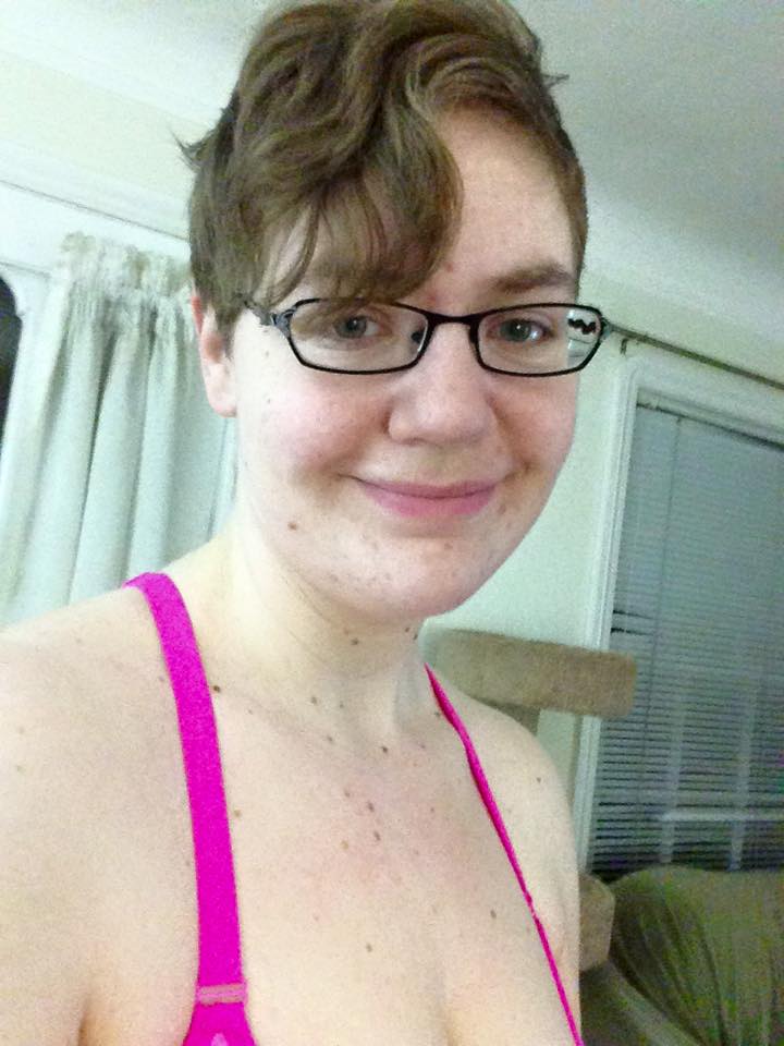 Left: Caitlin smiles lifelessly into the camera post-workout. They have brown hair, small frame glasses, extreme bags under their eyes - but at least their collarbone is visible!
