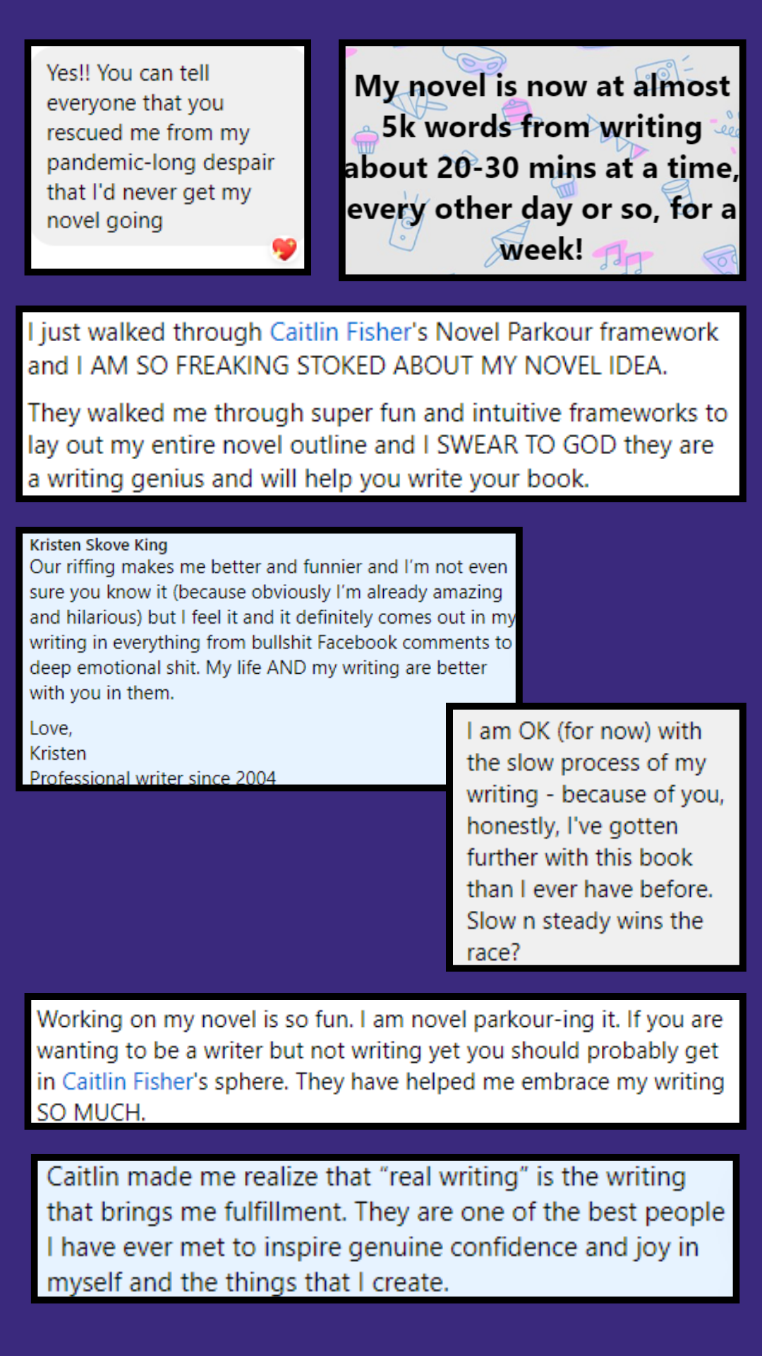 Novel Parkour is the chaotic baby of plotting (having a detailed, scene by scene outline for your book) and pantsing (just rolling with the story as it comes to you, by the seat of your pants). It takes the best of both worlds and turns them into an ADHD friendly approach that gives you enough structure to let your brain follow along, but still has plenty of space for you to change your mind and follow inspiration where it leads you.